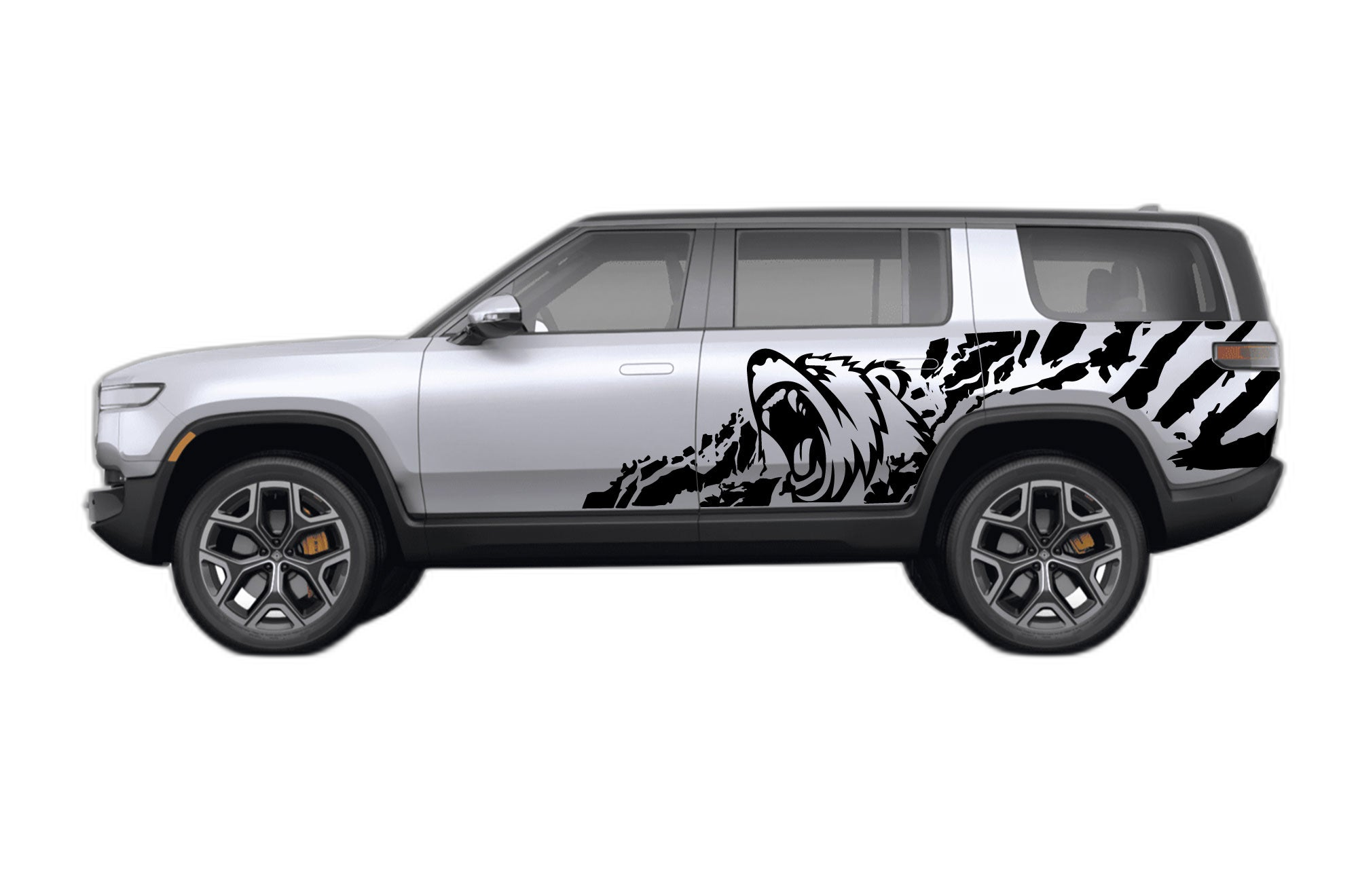 Bring the spirit of the wild to your Rivian R1S with these Bear Splash side graphics. This design features a powerful bear silhouette merged with a dynamic splash effect, perfect for nature enthusiasts and off-road adventurers alike.