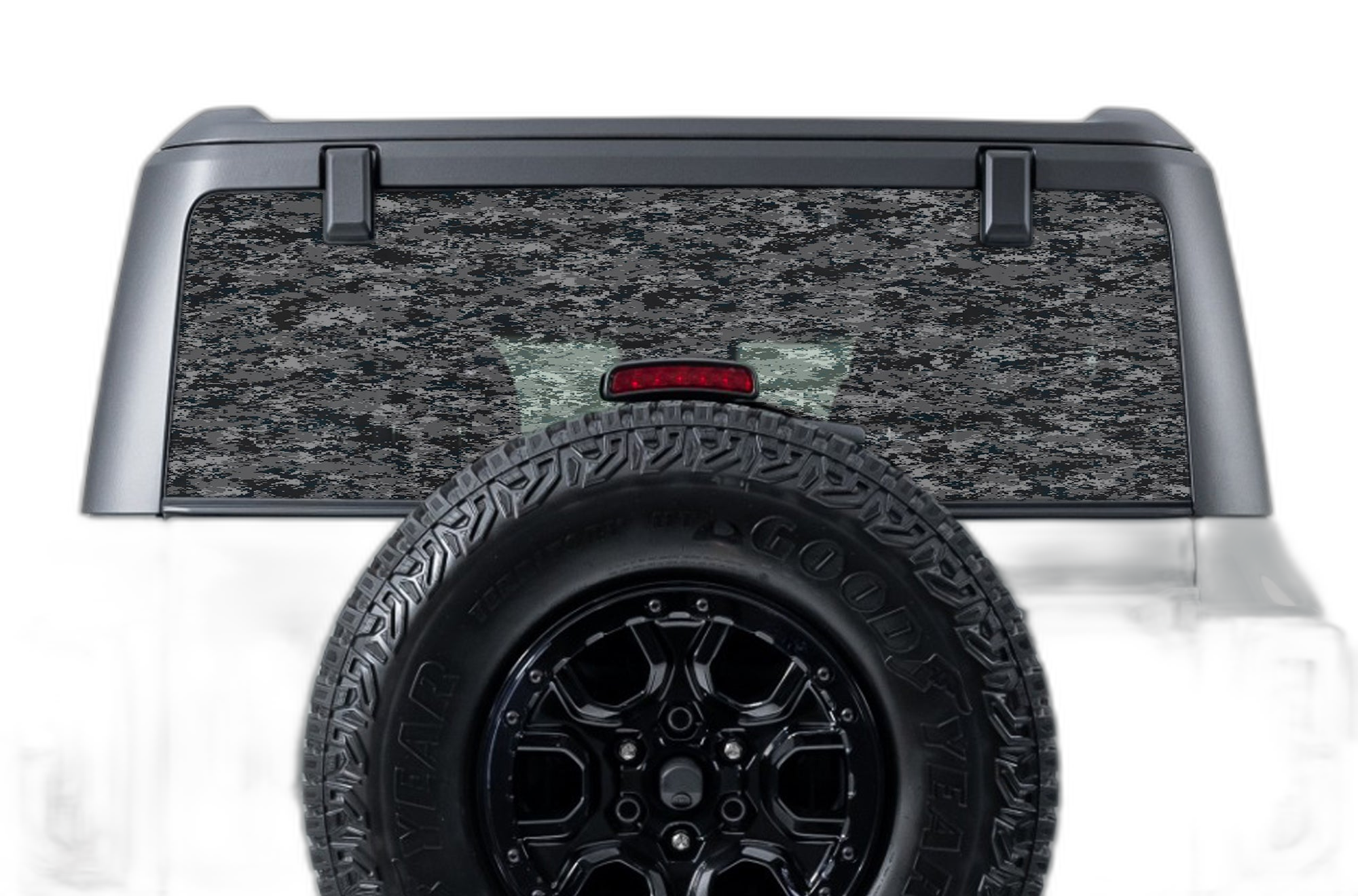 Give your Ford Bronco the ultimate adventure-ready look with our camo perforated rear window graphic. This design blends perfectly with your vehicle’s aesthetic while providing full rear visibility.