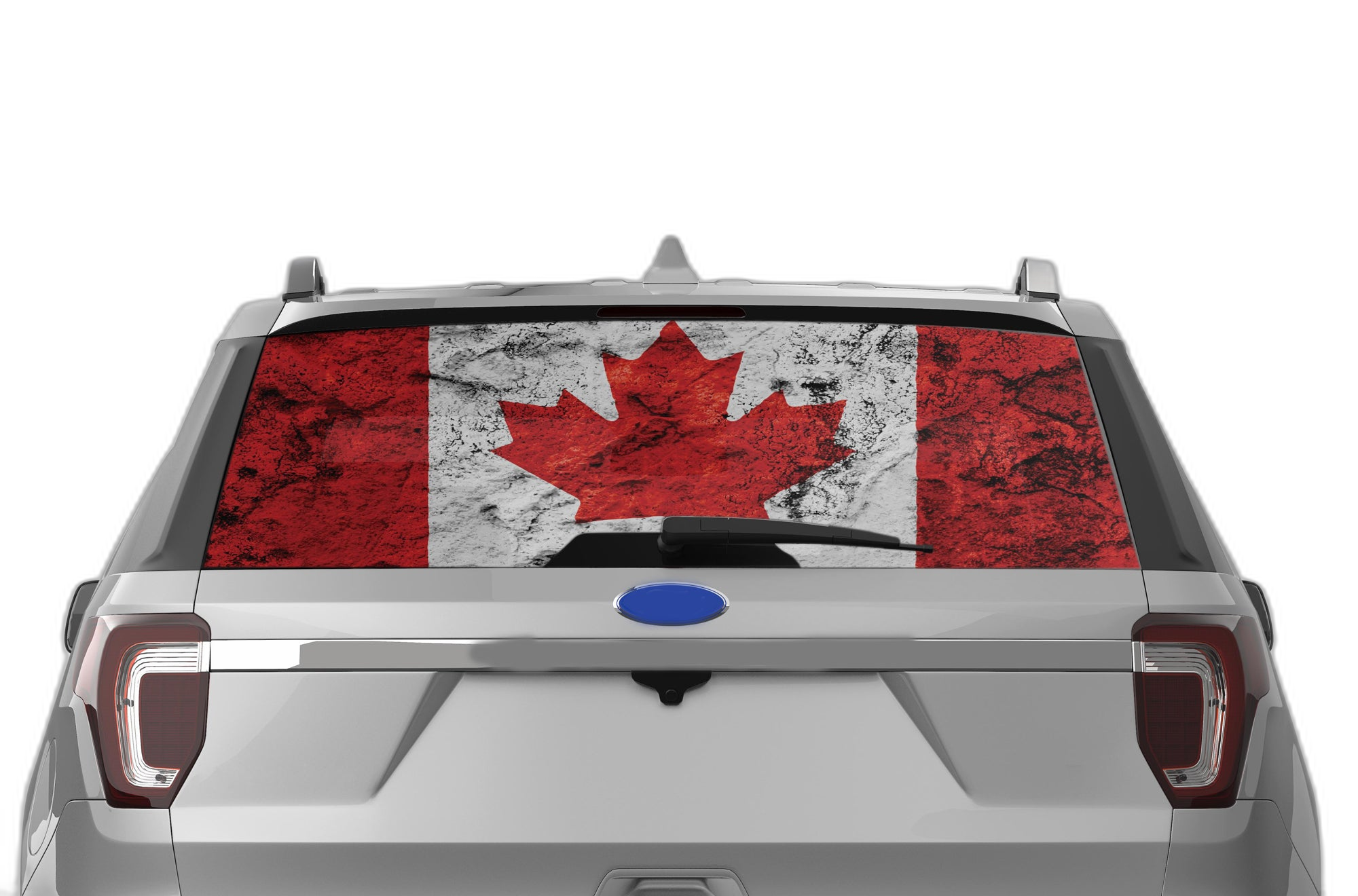 Show your pride with our Canada flag perforated rear window decal, perfectly sized for the 2011-2019 Ford Explorer. This high-resolution, full-color flag graphic provides a striking look while maintaining full rear-view safety thanks to the advanced perforated mesh design. From the outside, the flag appears vibrant and solid, yet from the inside, it allows for clear vision for the driver. Our premium-grade vinyl is UV-resistant and built to handle the harshest weather, from heavy rain and snow to direct sunlight, ensuring your graphic remains sharp and intact for years to come. Designed for a simple, professional installation, this decal fits your rear glass perfectly without the need for trimming. Ideal for any proud Canadian Ford Explorer owner, this graphic is the ultimate way to personalize your SUV. Durable, functional, and stylish, it’s a high-quality upgrade that combines national spirit with practical, safe vehicle customization for your daily driver.