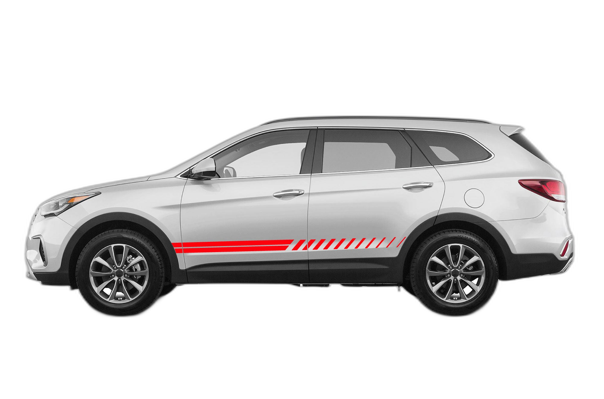 Give your Hyundai Santa Fe an aggressive, sporty stance with our custom lower panel stripe graphics. These decals are meticulously designed for the 2019-2023 Hyundai Santa Fe, perfectly hugging the lower contours of your vehicle to create a sleek, lowered appearance. Made from premium, long-lasting automotive vinyl, these stripes are engineered to resist road grime, UV exposure, and car wash detergents. The streamlined design complements the modern aesthetic of the Santa Fe, enhancing its road presence without overwhelming the factory lines. Installation is quick and simple, allowing you to achieve a custom look without professional help. Turn heads on the street with this subtle yet effective upgrade that highlights the dynamic profile of your SUV.