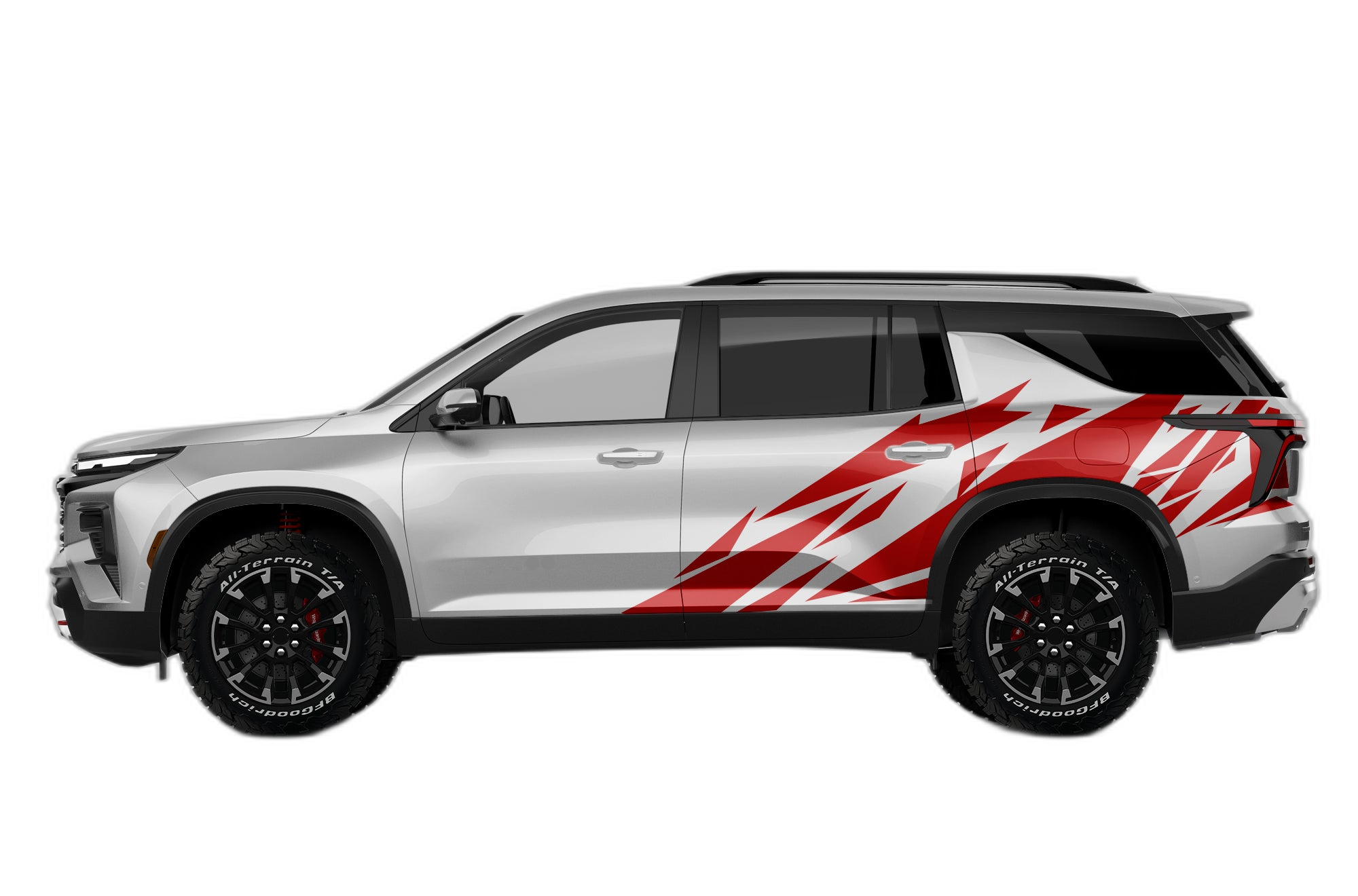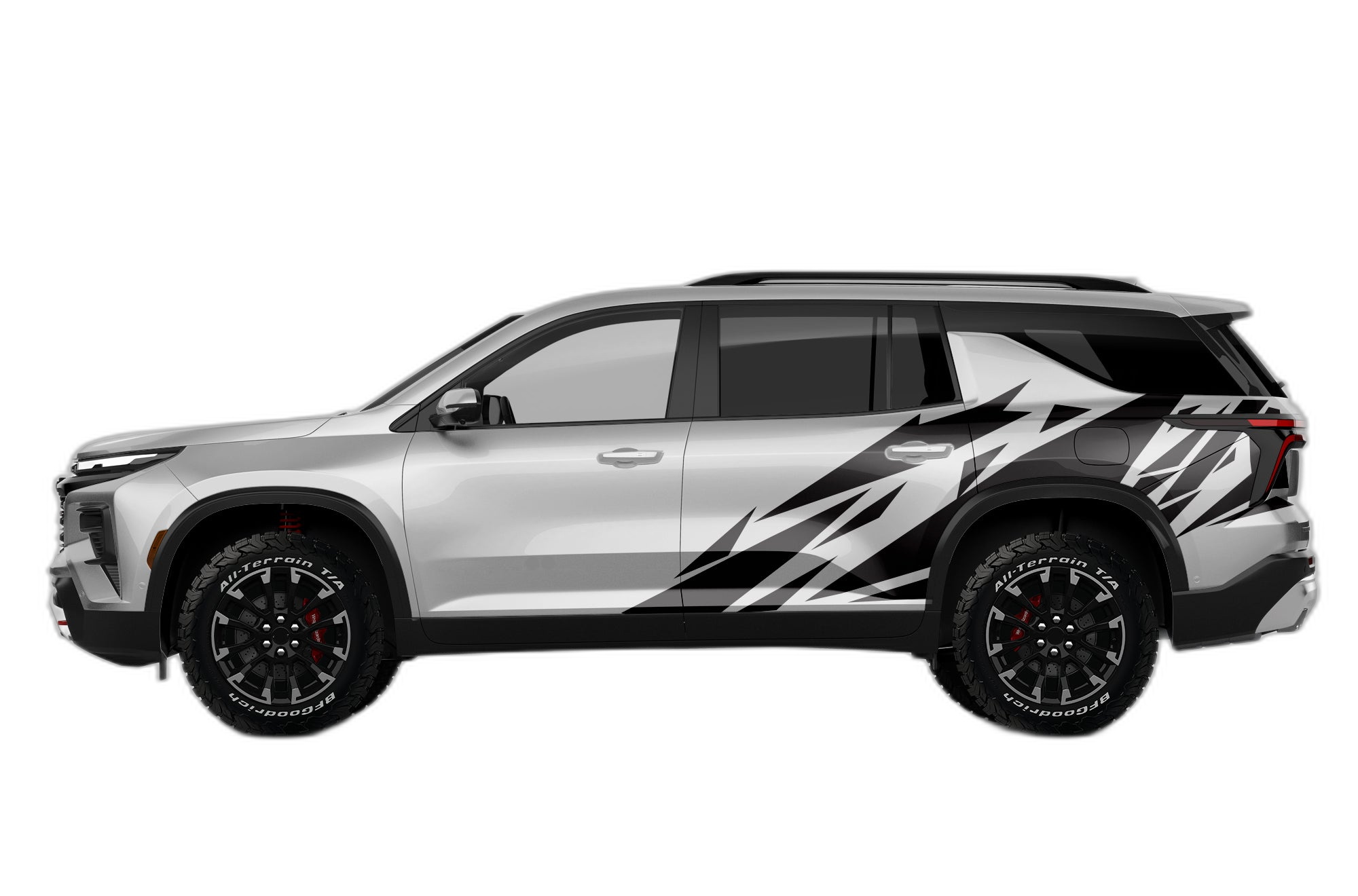 Upgrade the aesthetic of your vehicle with our custom-designed geometric side graphics, tailored for a precise look on your Chevrolet Traverse. These decals provide a modern, stylized appearance that integrates seamlessly with your SUV’s factory styling.