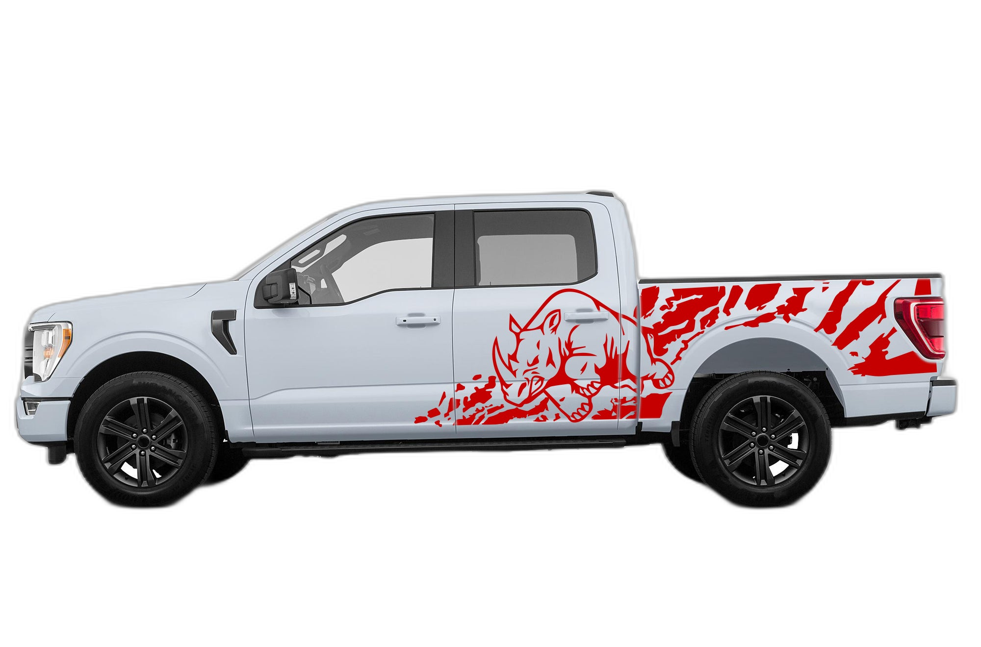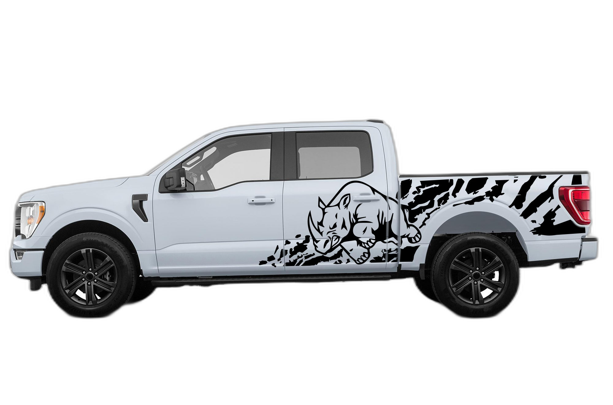 Transform your Ford F150 with our dynamic Rhino splash graphics. This set is designed to add a rugged, artistic flair to your truck’s side profile.