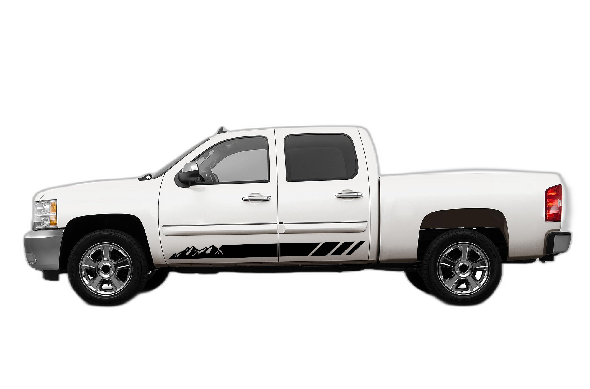 Upgrade your 2007-2013 Chevrolet Silverado with our rocker panel mountain stripes. These decals provide a subtle yet adventurous detail to the lower side of your GMT900 truck, perfect for those who want an off-road inspired look.