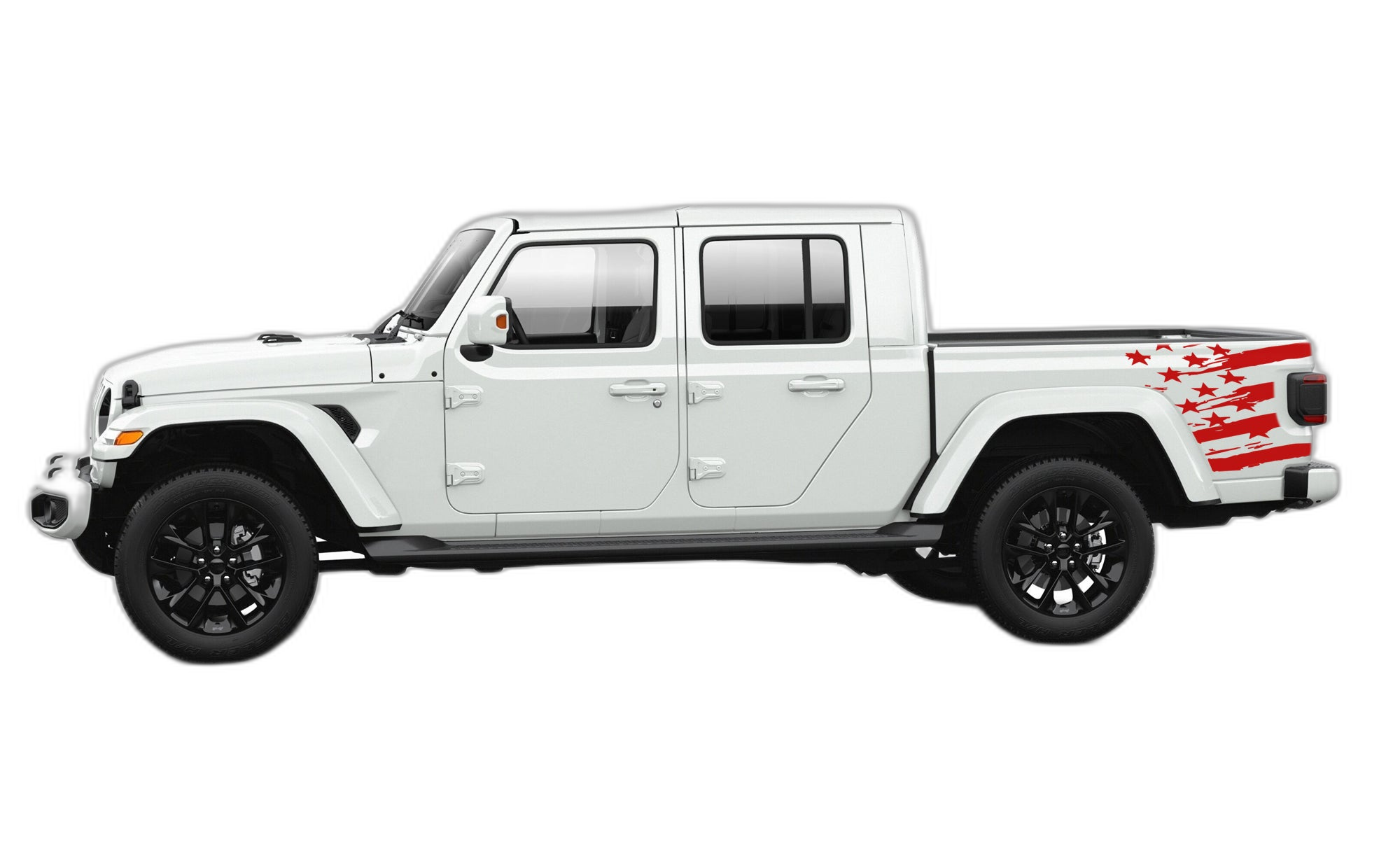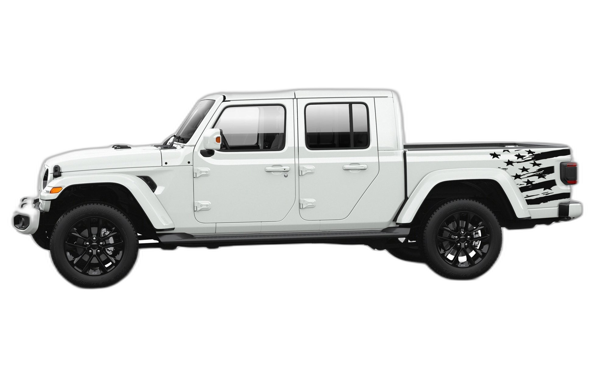 Side back shredded US flag graphics decals compatible with Jeep Gladiator JT adds a bold custom styling touch to your Jeep Gladiator with a clean motorsport-inspired decal look. This design is intended for the listed fitment and works well for drivers who want sharper side profile styling without a full wrap. The graphic is suited for enthusiasts who value a strong visual upgrade, easy maintenance, and a finish that stands out on the street or at events. Always confirm your vehicle generation and prepare the surface correctly before installation for the best result. This product is a great option for refreshing the appearance of your build while keeping the install focused, practical, and visually aggressive.