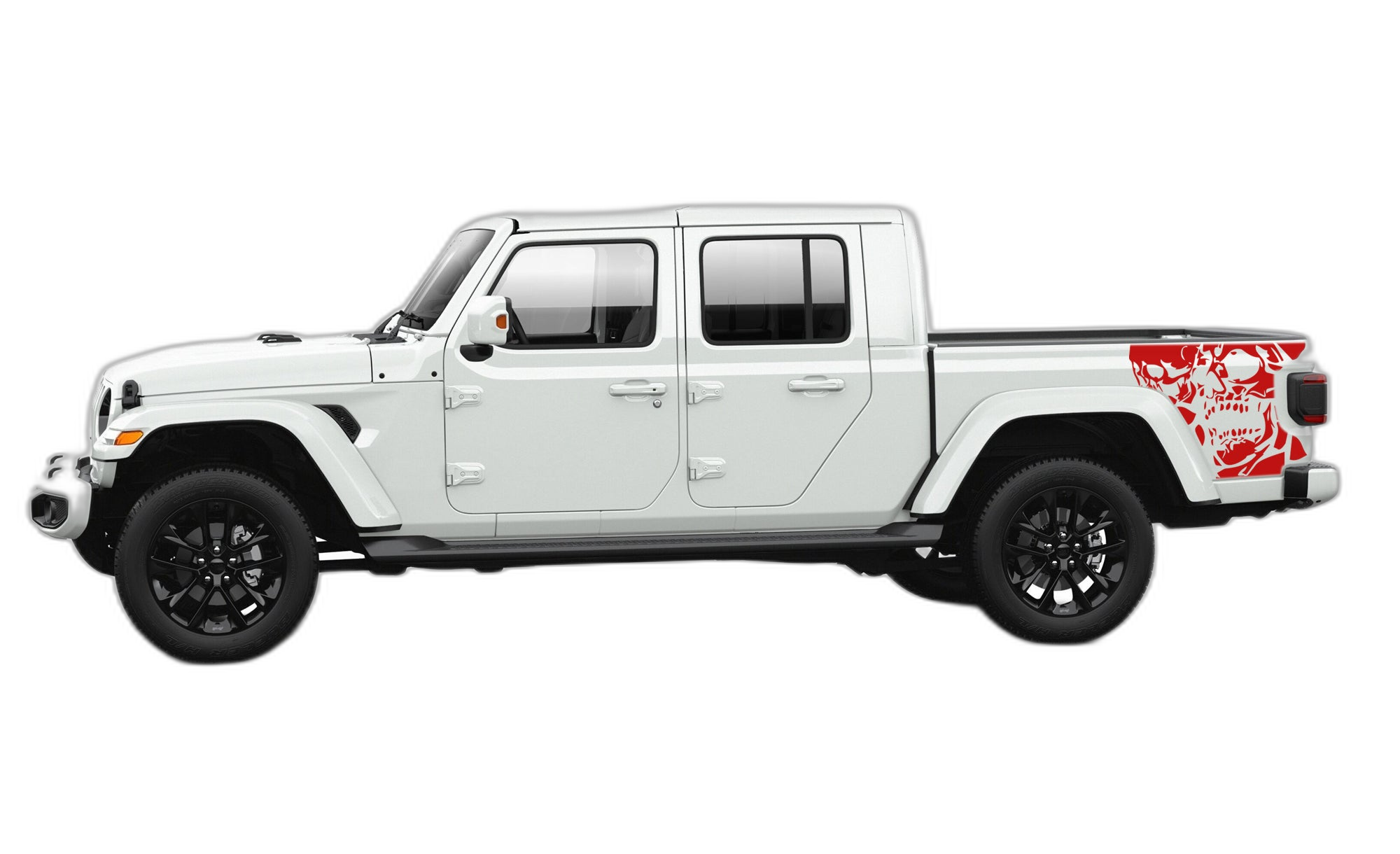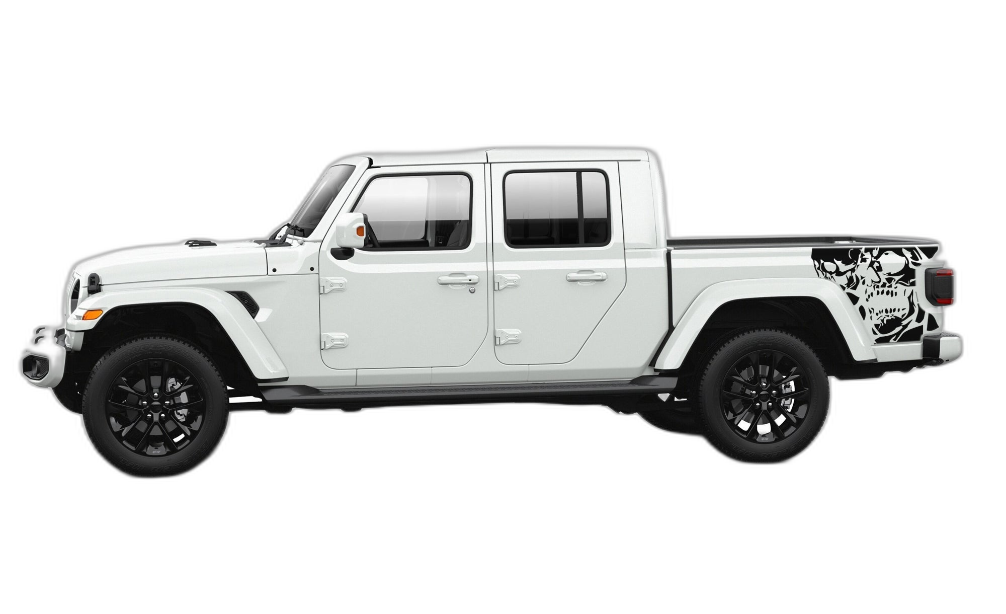 Inject some attitude into your Jeep Gladiator JT with these edgy side-back skull graphics. Designed for those who want their truck to stand out from the ordinary, this decal set brings a dark, bold aesthetic to the side panels of your Gladiator. Manufactured from high-quality, weather-proof vinyl, these graphics are designed to maintain their sharp, menacing detail through years of exposure to sun, rain, and off-road grit. The precision-cut design follows the specific body contours of the Gladiator, ensuring a professional appearance that looks like it was applied at the factory. These durable decals are built to last, resisting scratches and UV damage during your roughest adventures. If you are looking for a modification that combines artistic flair with rugged durability, these skull decals are the perfect addition to your vehicle. Installation is a straightforward process, letting you achieve a customized, aggressive look that reflects your unique personality on every trail you conquer.