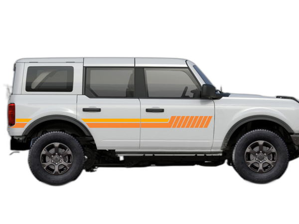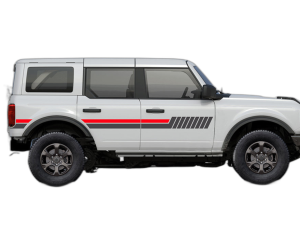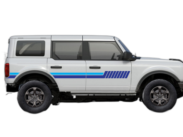 Side hash lines stripes graphics decals compatible with Ford Bronco adds a bold custom styling touch to your Ford Bronco with a clean motorsport-inspired decal look. This design is intended for the listed fitment and works well for drivers who want sharper side profile styling without a full wrap. The graphic is suited for enthusiasts who value a strong visual upgrade, easy maintenance, and a finish that stands out on the street or at events. Always confirm your vehicle generation and prepare the surface correctly before installation for the best result. This product is a great option for refreshing the appearance of your build while keeping the install focused, practical, and visually aggressive.