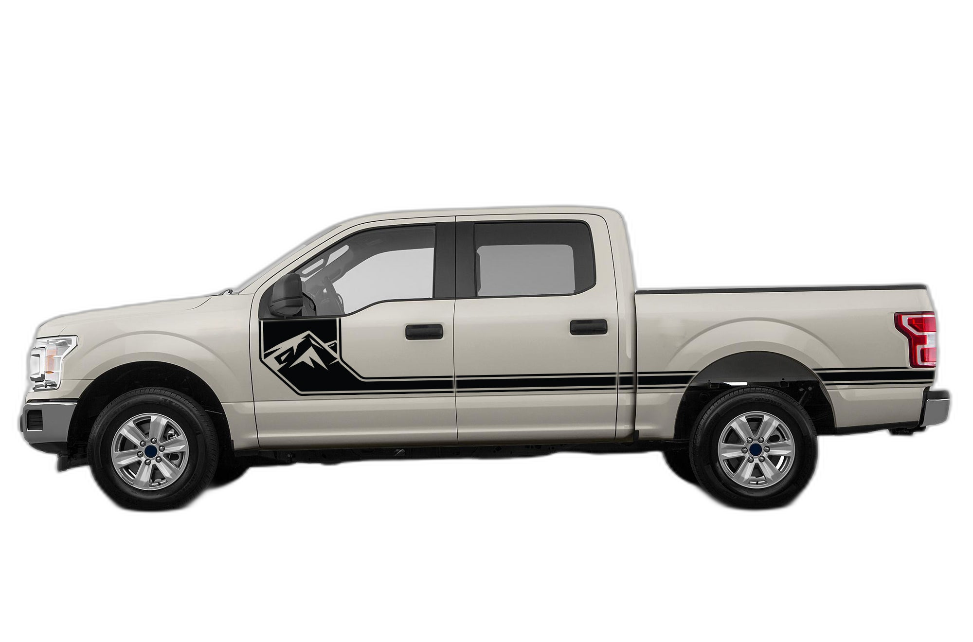 Adventure-inspired design meets automotive styling with these side line mountain stripe decals. Specifically sized for the side profiles of the 2015-2020 Ford F150, these graphics provide a dynamic, flowing look to your truck’s side panels.