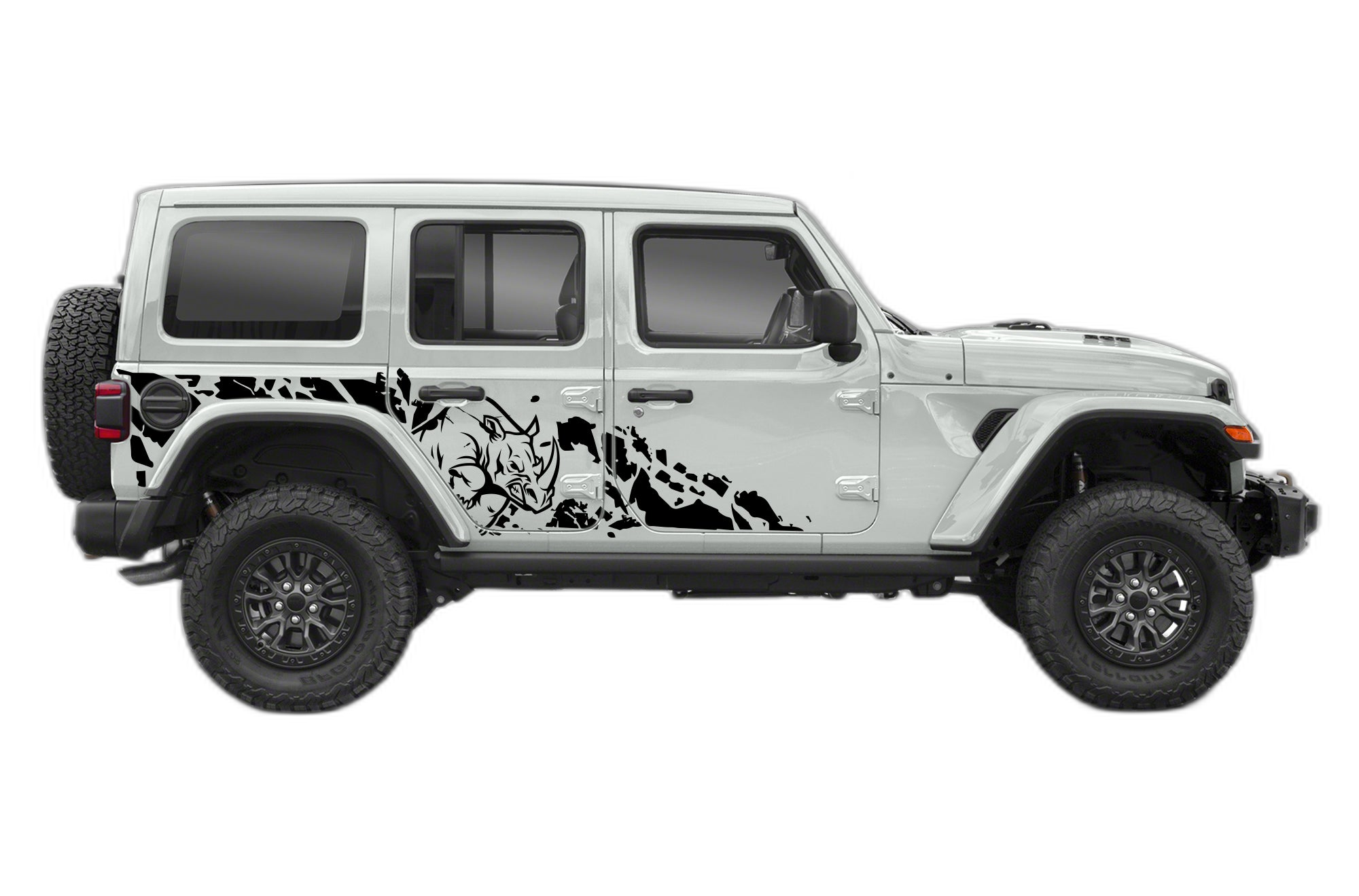 Make your Jeep Wrangler JL Unlimited look as tough as it acts with our rhino-themed side splash graphics. This design features a unique, aggressive splash pattern combined with a rhino silhouette, perfectly capturing the spirit of off-road strength. It’s an ideal way to add custom personality to your JL’s side panels, helping it stand out both on the trail and in the city. We use high-performance, weather-resistant automotive vinyl that is fully rated for outdoor use, ensuring your graphics withstand the harsh impacts of brush, mud, and intense UV rays without fading or peeling. Precision-cut to align perfectly with the JL Unlimited’s body, the installation is a simple and rewarding process. Protect your paint from light scuffs and express your love for raw power with this durable, high-impact graphic kit. Upgrade your Wrangler today with a design that is built for adventure and looks great in every setting.