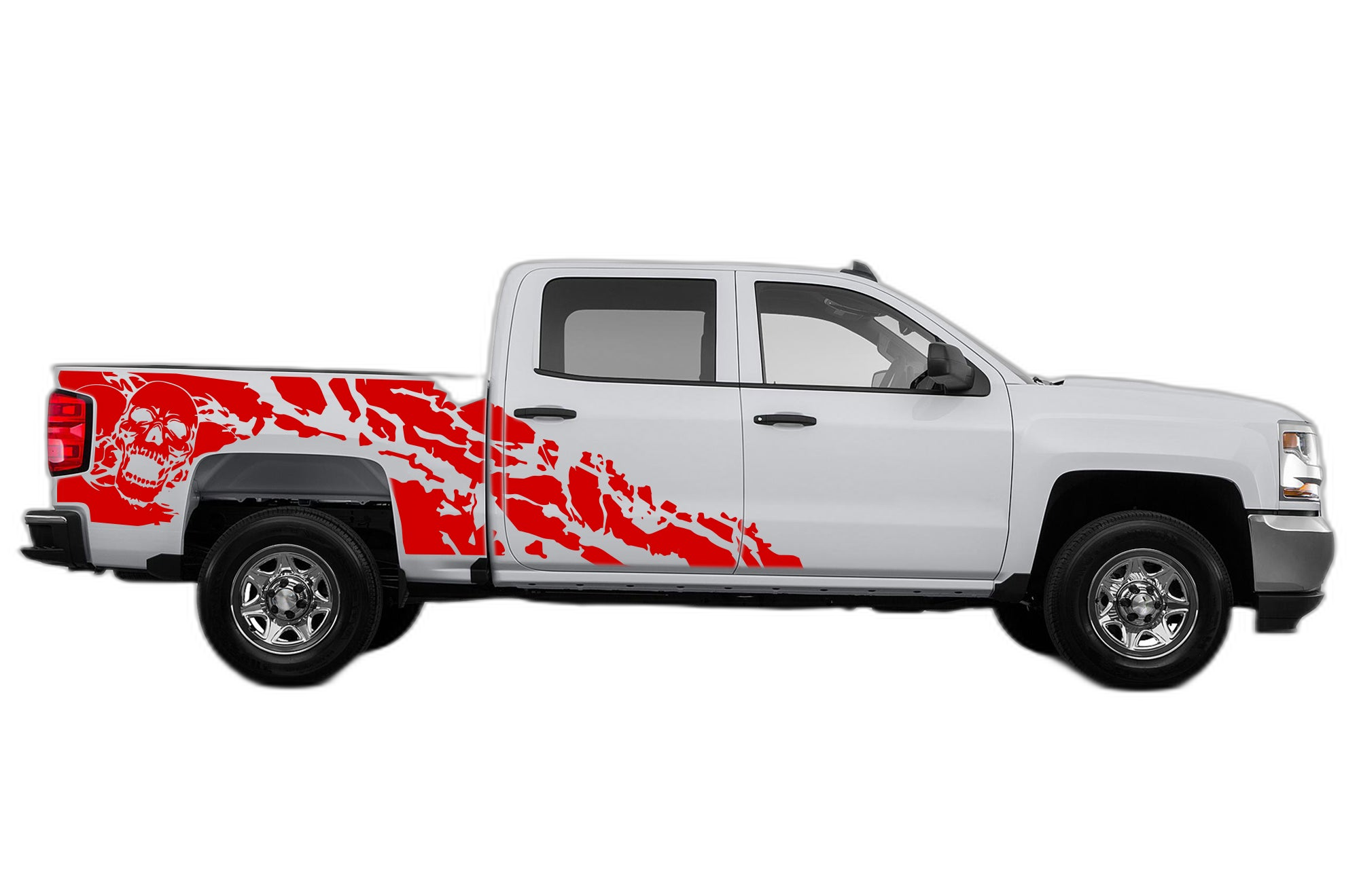 Bring an edgy and bold look to your truck with our skull shredded graphic set. These decals are designed to flow with the contours of the Silverado, giving it a customized, high-performance aesthetic.