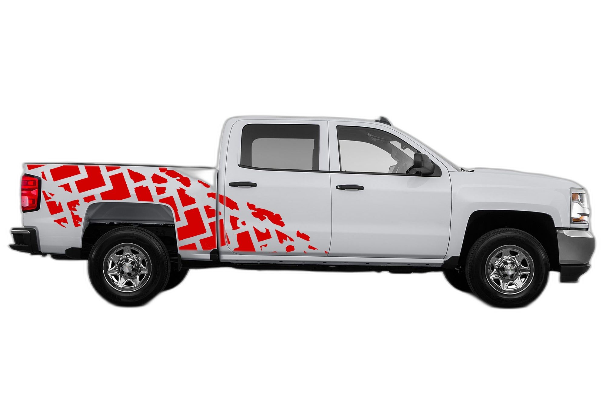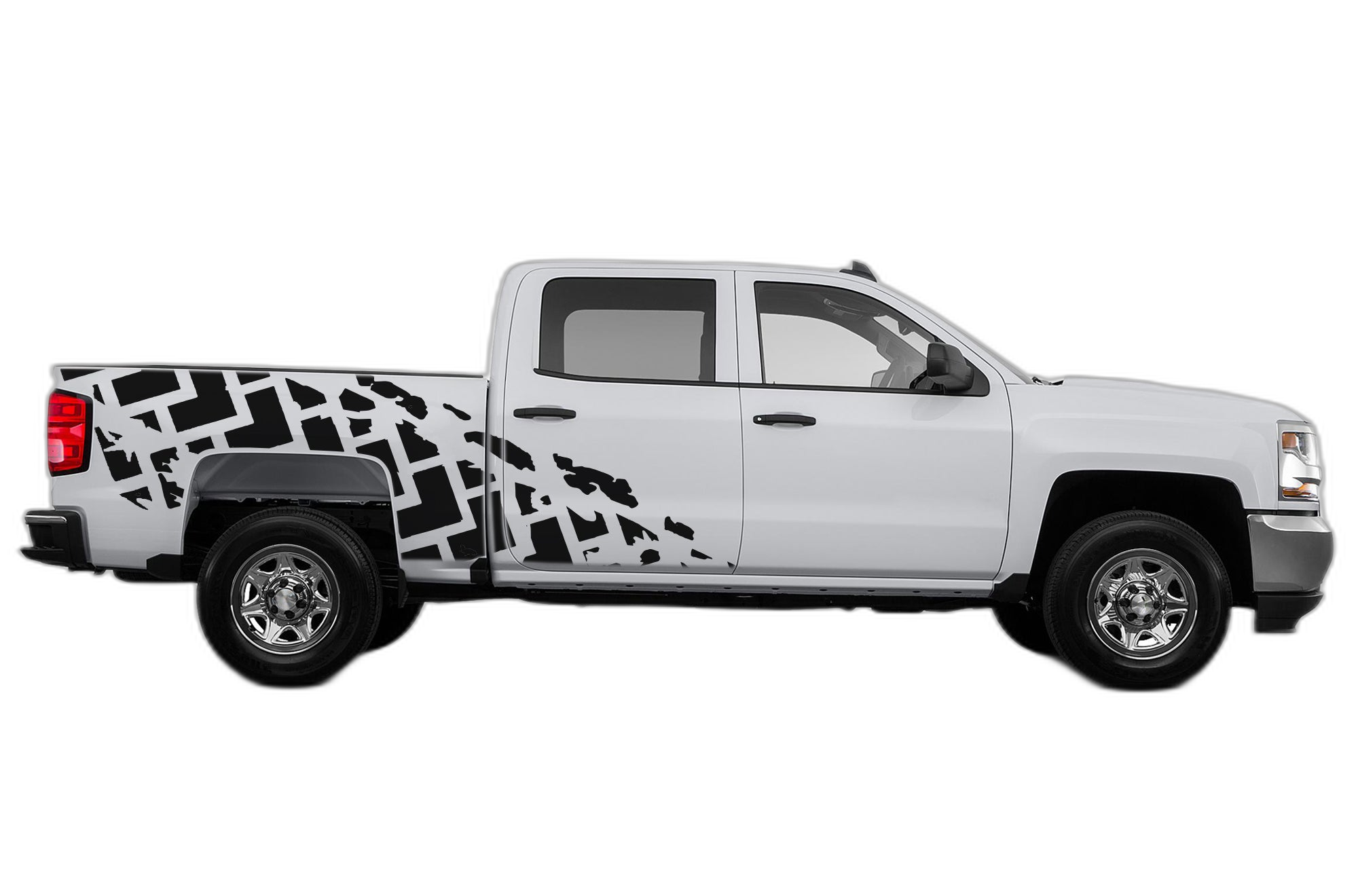 Celebrate your off-road lifestyle with these tire-tread themed side graphics for the 2014-2018 Chevrolet Silverado. These decals add a mechanical, off-road look that highlights the performance nature of the GMTK2XX generation.