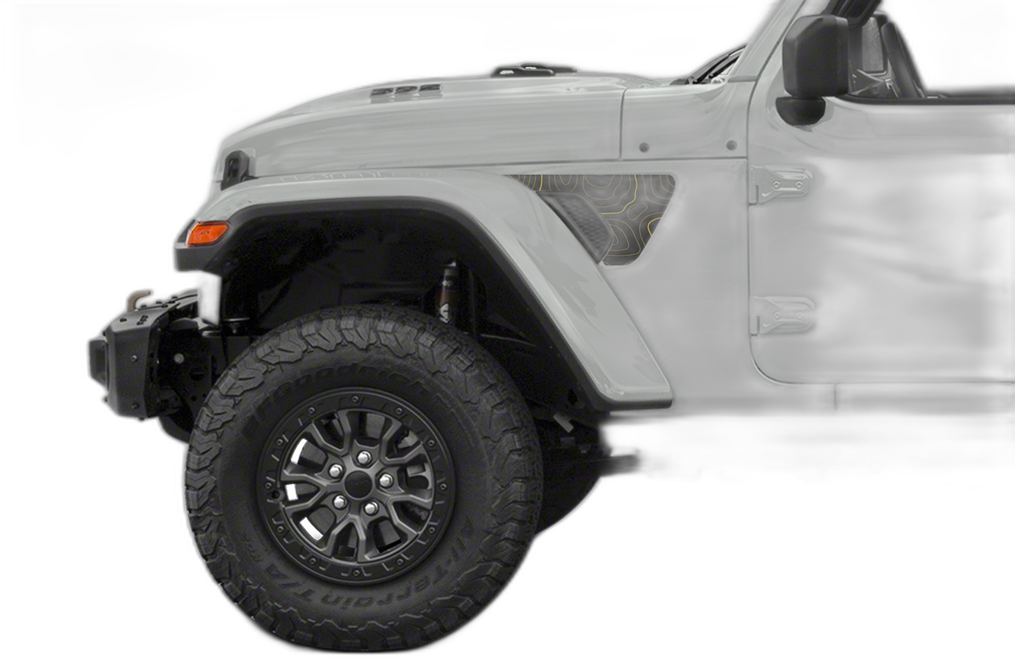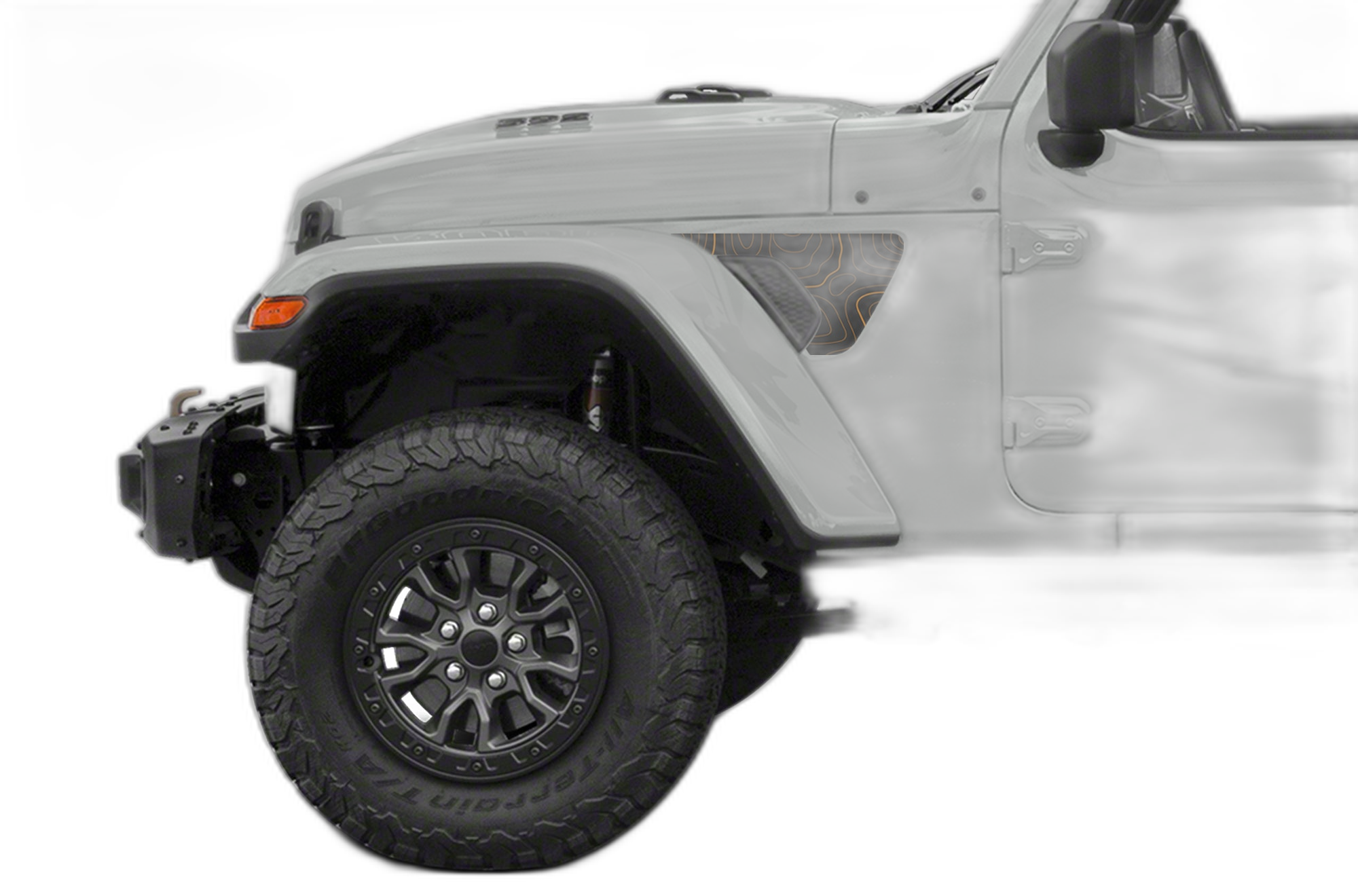 Add a layer of texture and detail to your vehicle’s profile with these topographic fender vent decals. Designed to integrate cleanly with the existing vent styling on the Jeep Wrangler JL.