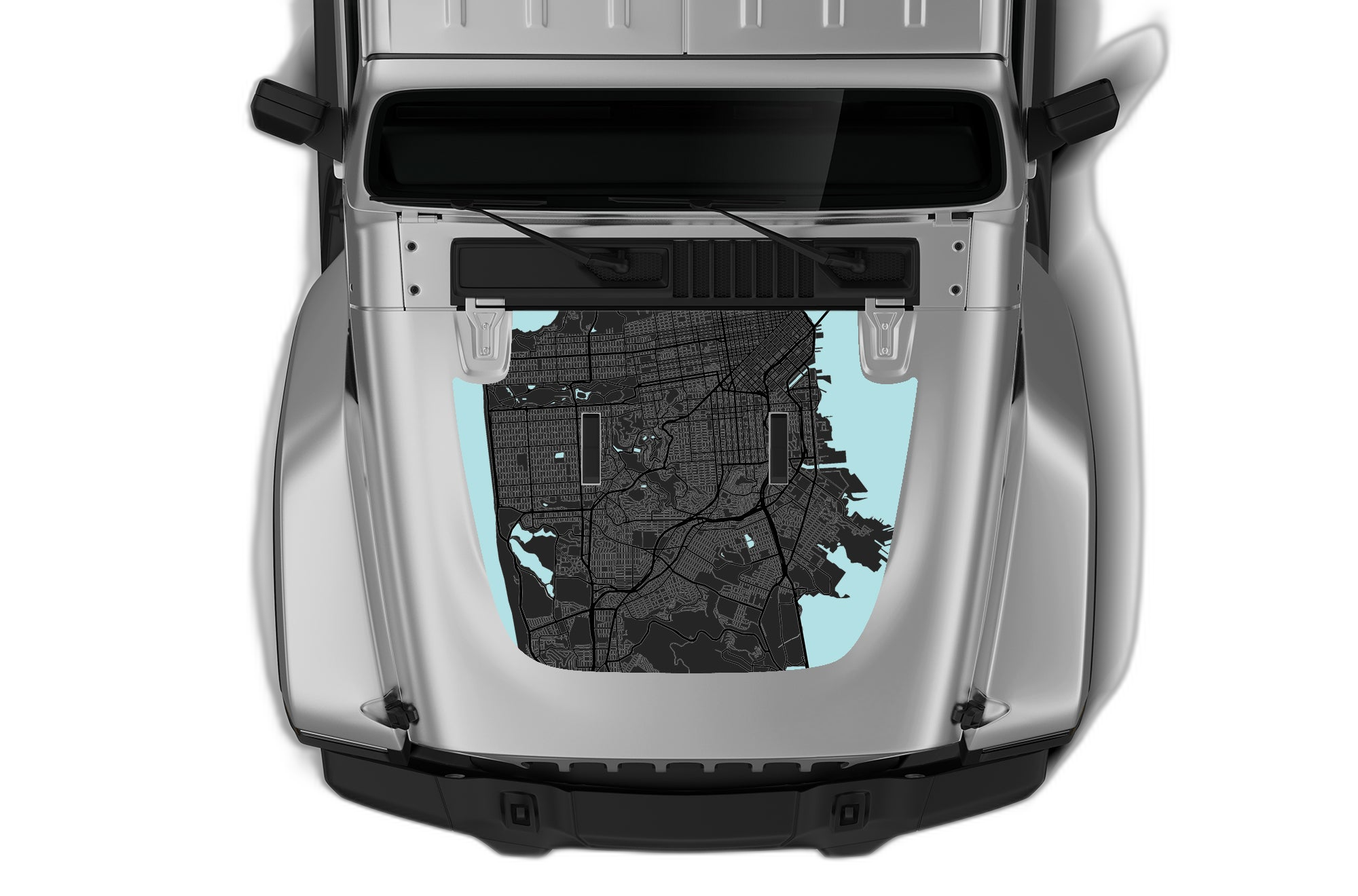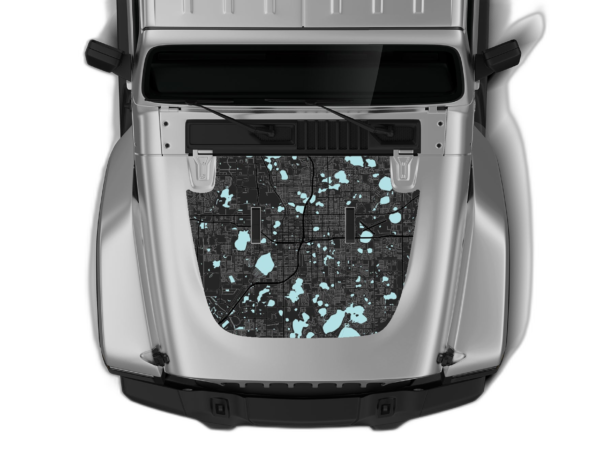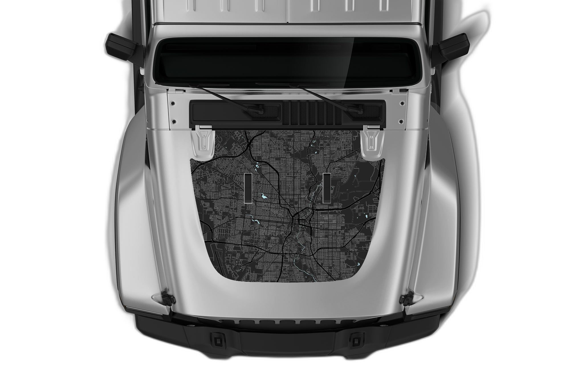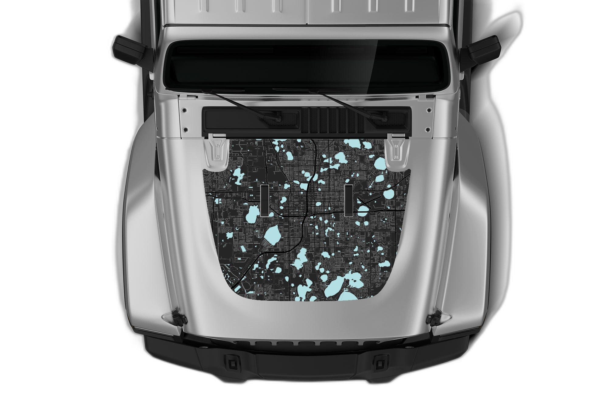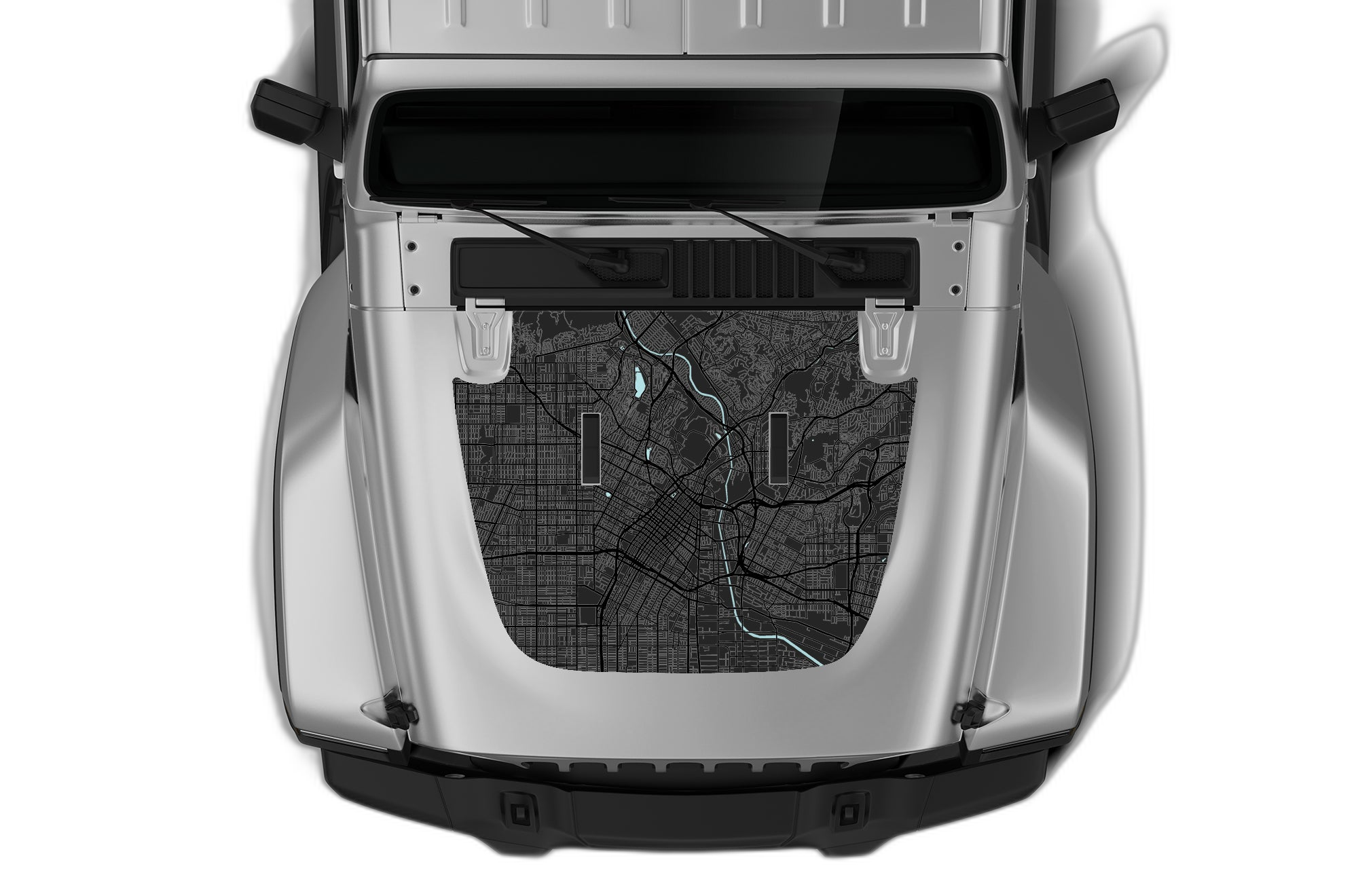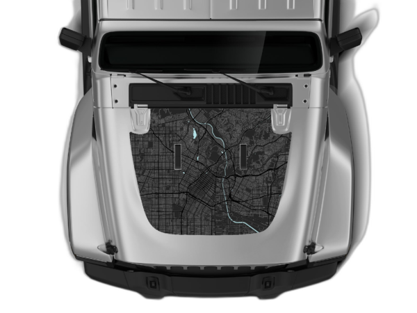 Adventure awaits with this topographical map hood graphic, featuring custom city prints for the Jeep Wrangler JL. This graphic brings a sophisticated, mapping-inspired aesthetic to the front of your vehicle.