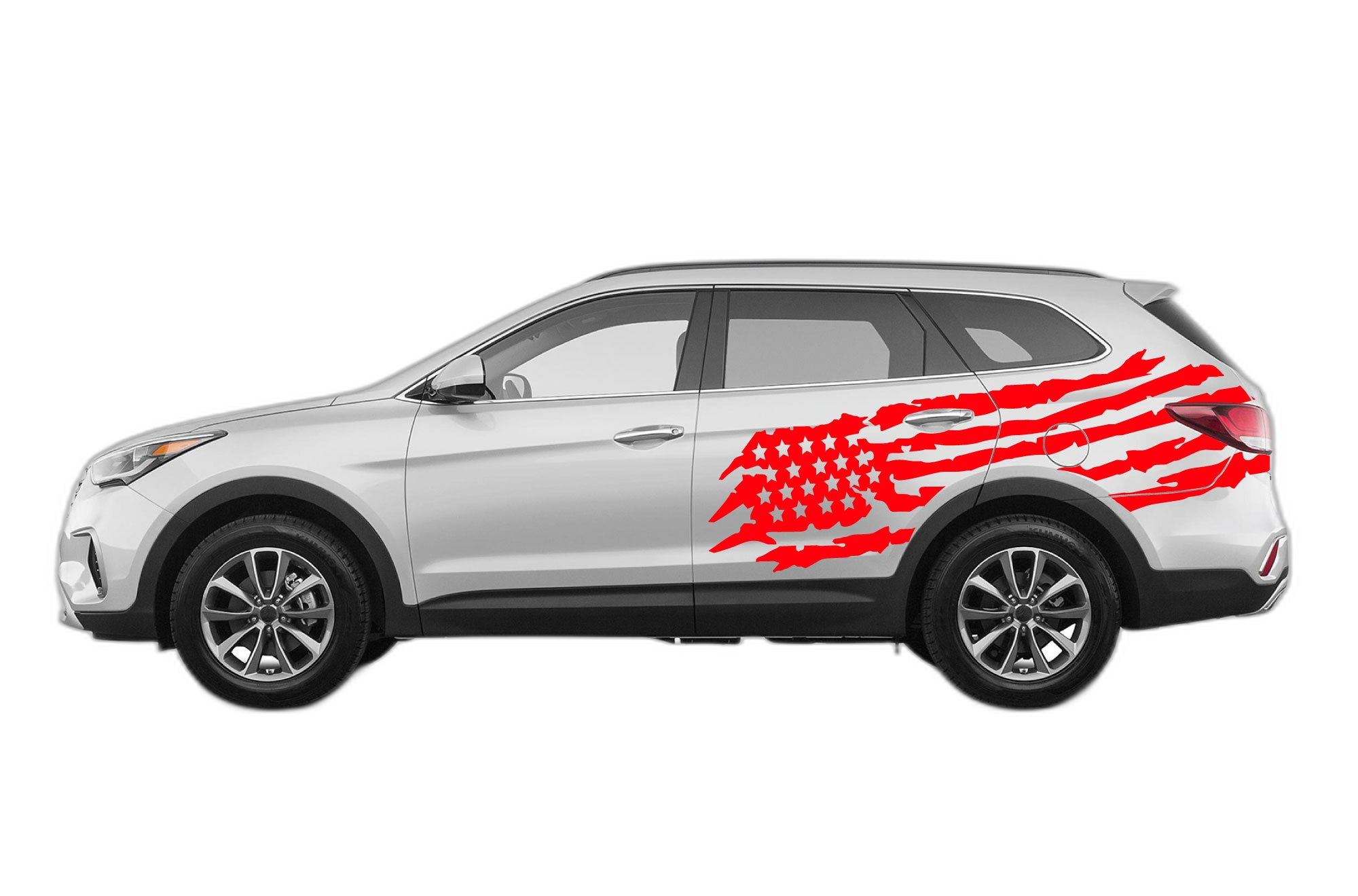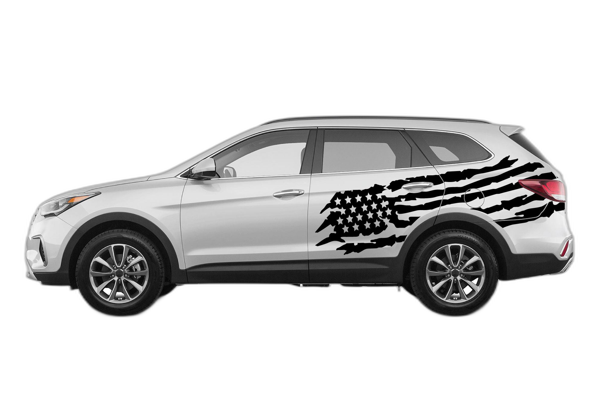 Display your patriotism with these stylized US flag graphics, designed to integrate seamlessly with the exterior profile of your Hyundai Santa Fe. This set offers a classic, striking look that complements the vehicle’s modern design.