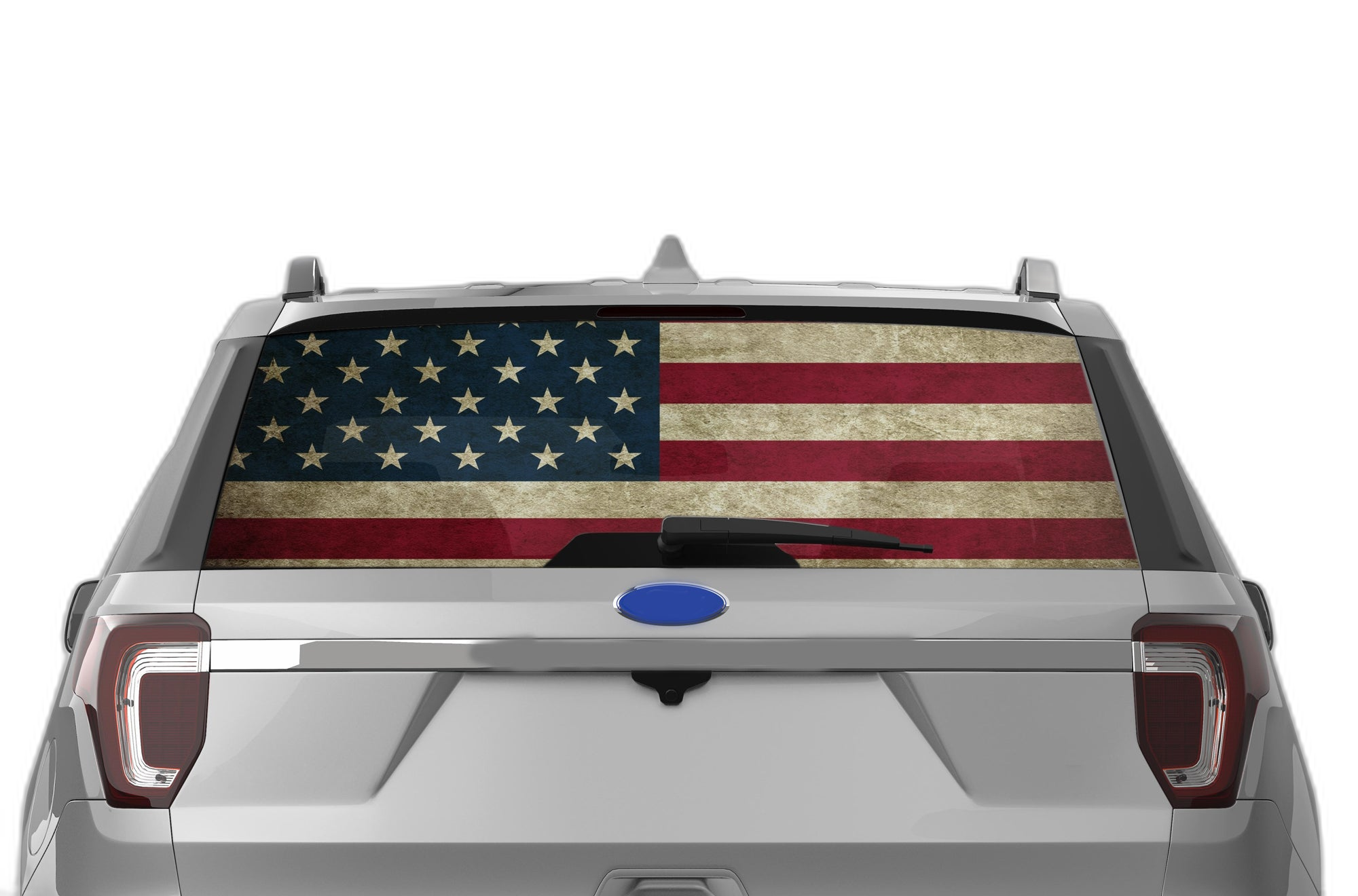 Represent your spirit with this US flag perforated rear window decal, perfectly sized for the 2011-2019 Ford Explorer. This window wrap combines a classic flag design with functional, view-through visibility.