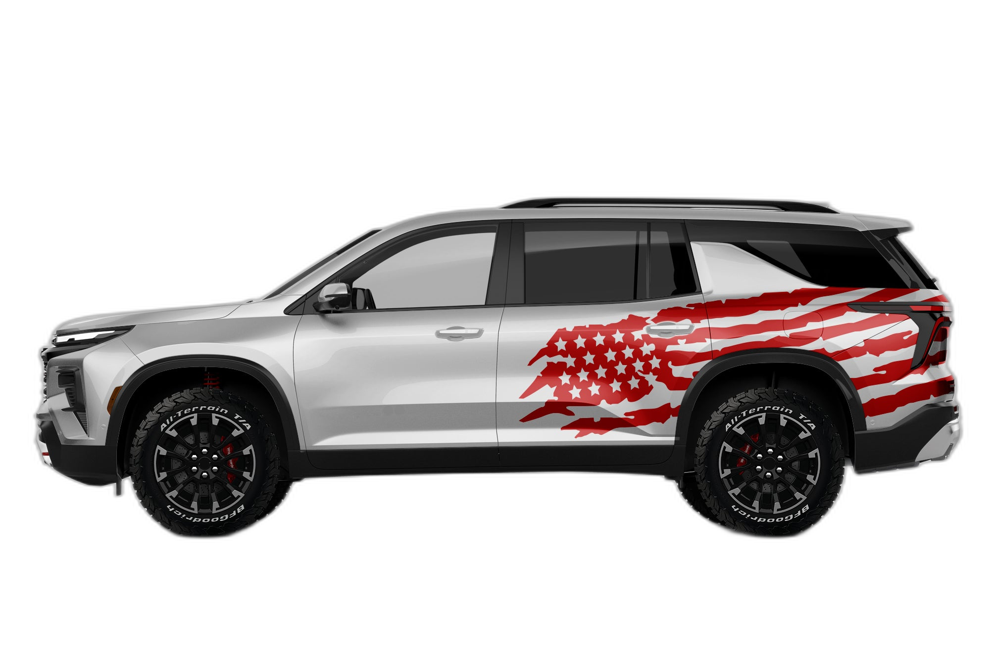 US flag side graphics decals compatible with Chevrolet Traverse adds a bold custom styling touch to your Chevrolet Traverse with a clean motorsport-inspired decal look. This design is intended for the listed fitment and works well for drivers who want sharper side profile styling without a full wrap. The graphic is suited for enthusiasts who value a strong visual upgrade, easy maintenance, and a finish that stands out on the street or at events. Always confirm your vehicle generation and prepare the surface correctly before installation for the best result. This product is a great option for refreshing the appearance of your build while keeping the install focused, practical, and visually aggressive.