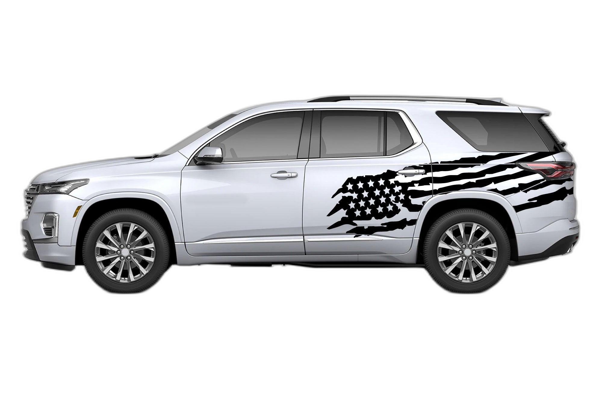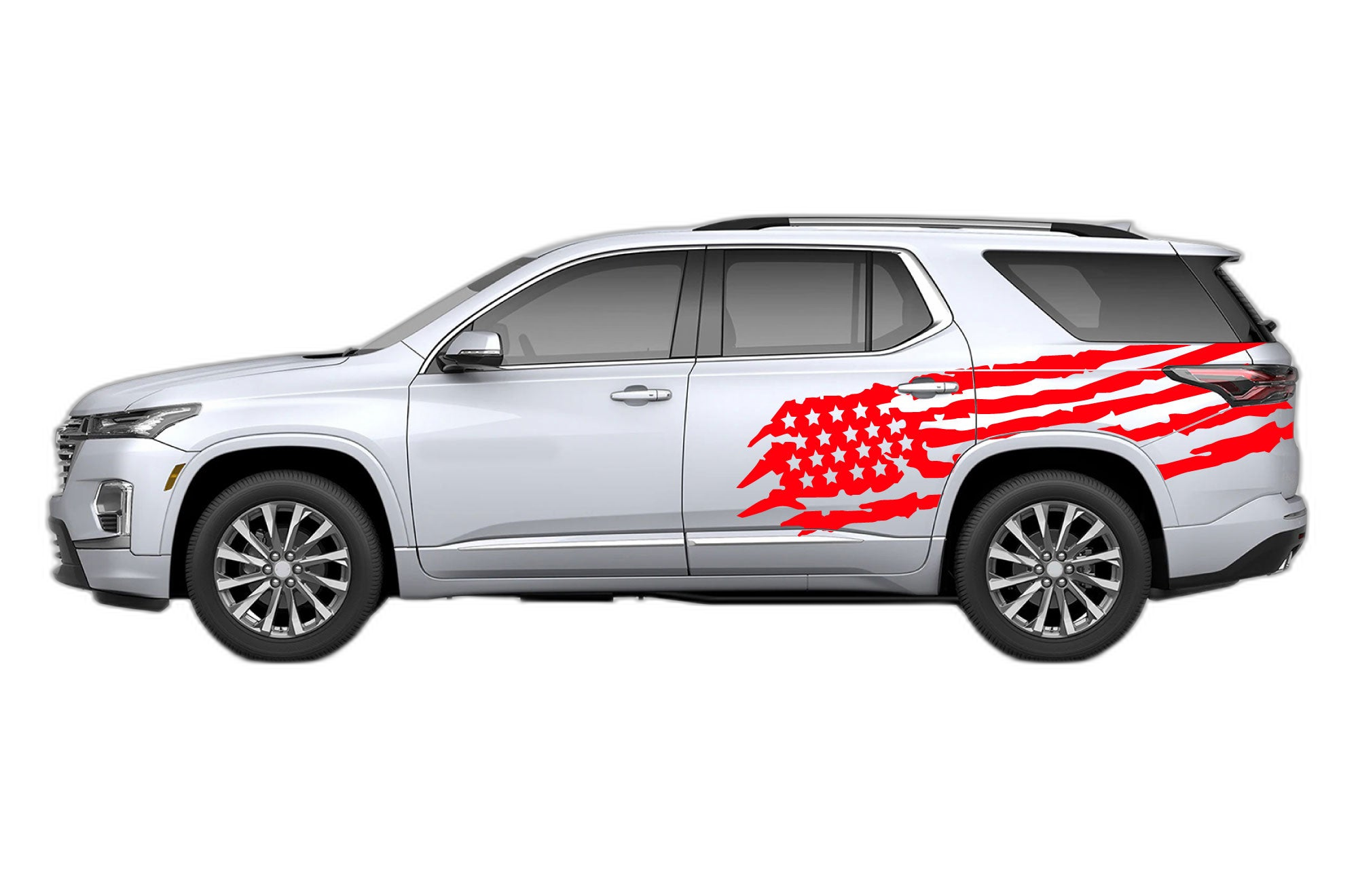 Represent with pride using these US flag side graphics. Tailored for the Chevrolet Traverse, these decals are perfect for owners wanting to integrate a patriotic theme into their vehicle’s exterior.