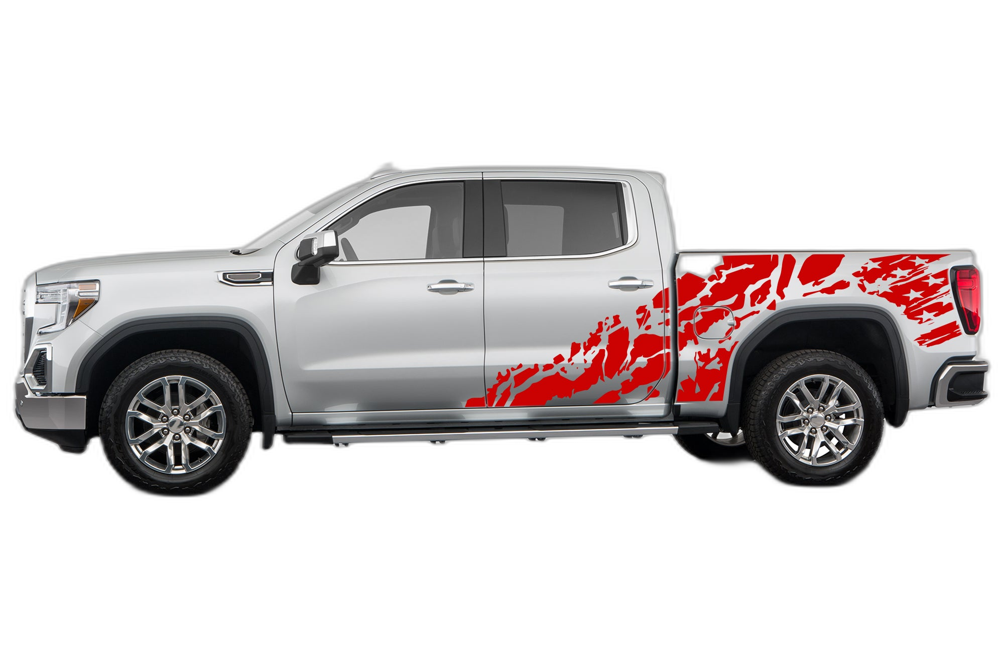Show your patriotic spirit with our USA flag shredded decals, custom-made for the GMC Sierra. These graphics combine rugged styling with a bold national design, perfectly contoured to match the sleek lines of your truck. Whether you are hitting the highway or exploring off-road, these decals maintain their sharp look thanks to premium, UV-protected vinyl material. Specifically designed to be compatible with 3rd, 4th, and 5th Generation GMC Sierra models, this kit ensures a professional-grade appearance without the need for a full paint job. The shredded design adds a dynamic, distressed aesthetic that perfectly embodies the adventurous nature of the Sierra. Easy to install and built to last, our decals are the perfect way to personalize your truck while displaying your love for the country with a high-impact, long-lasting exterior upgrade.